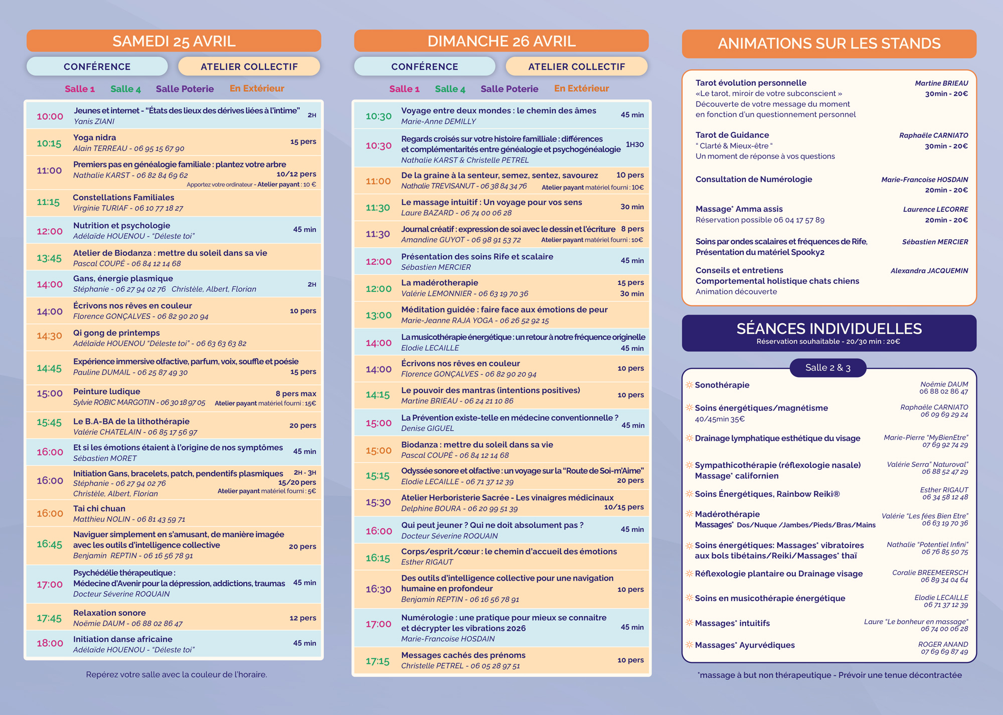 Au programme : ateliers pratiques, expériences immersives, conférences inspirantes, séances de massage, soins énergétiques, méditation, et bien d’autres pratiques dédiées au mieux-être global.